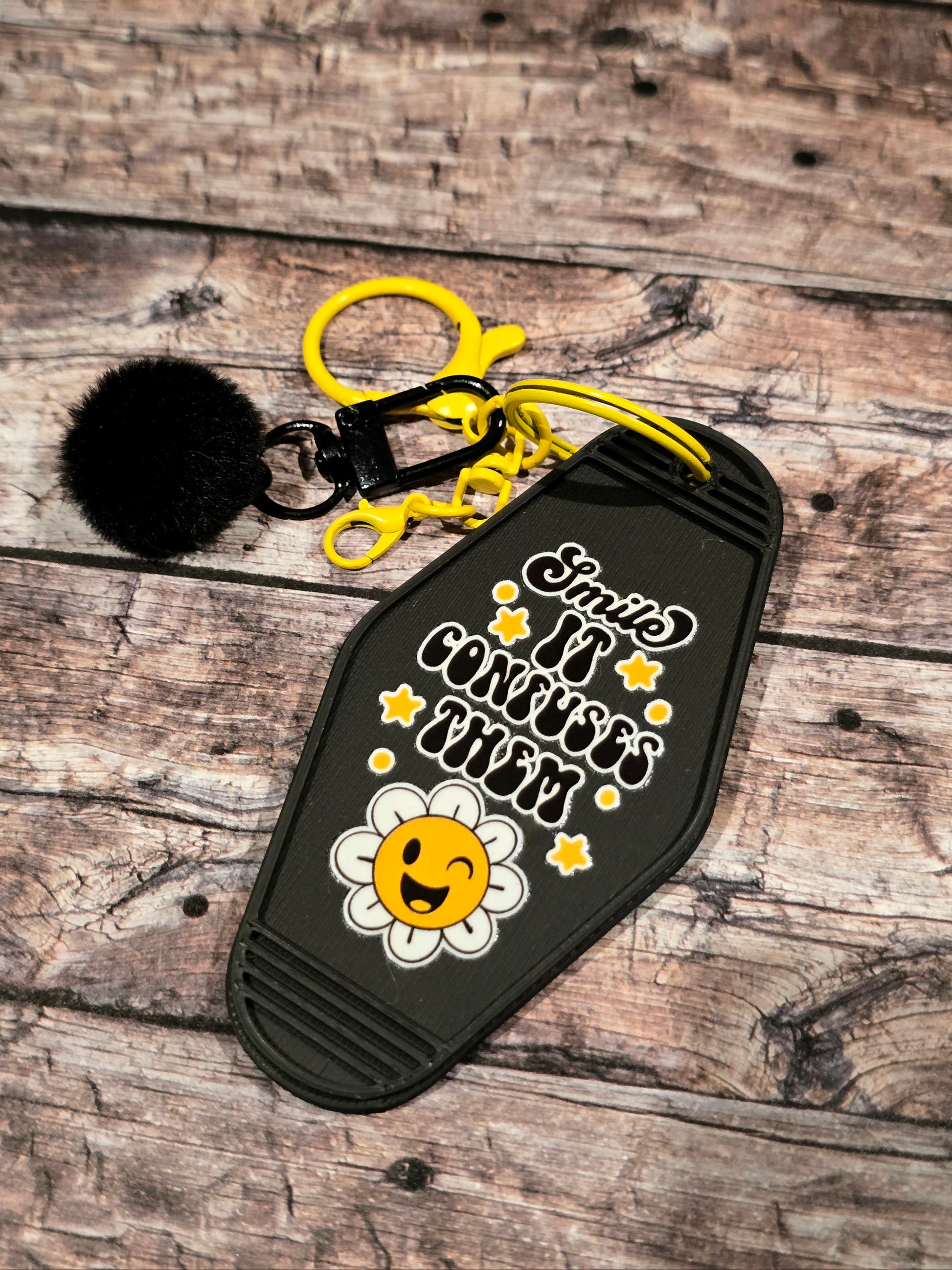 This 3D printed motel-style keychain features a sleek black base with bright yellow accents, playful stars, and a happy daisy design that brings cheerful energy to your everyday essentials. Lightweight yet durable, itโs perfect for keys, bags, backpacks, or as a feel-good gift, because life feels better when you bloom and smile. ๐ผ๐